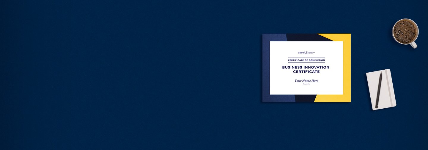 After completing the two courses, you’ll receive your Business Innovation Certificate of completion via email as a downloadable PDF within 1-2 weeks of completing the final required course. Certificates are configured for uploading and sharing on LinkedIn.